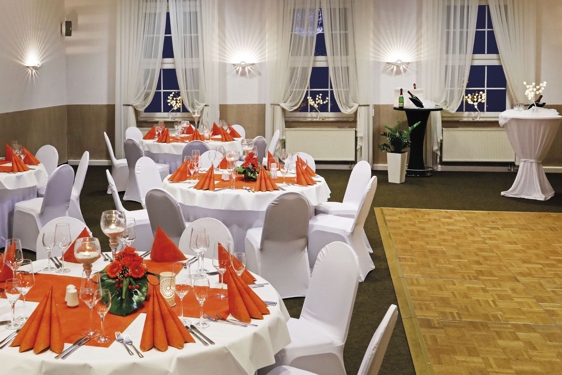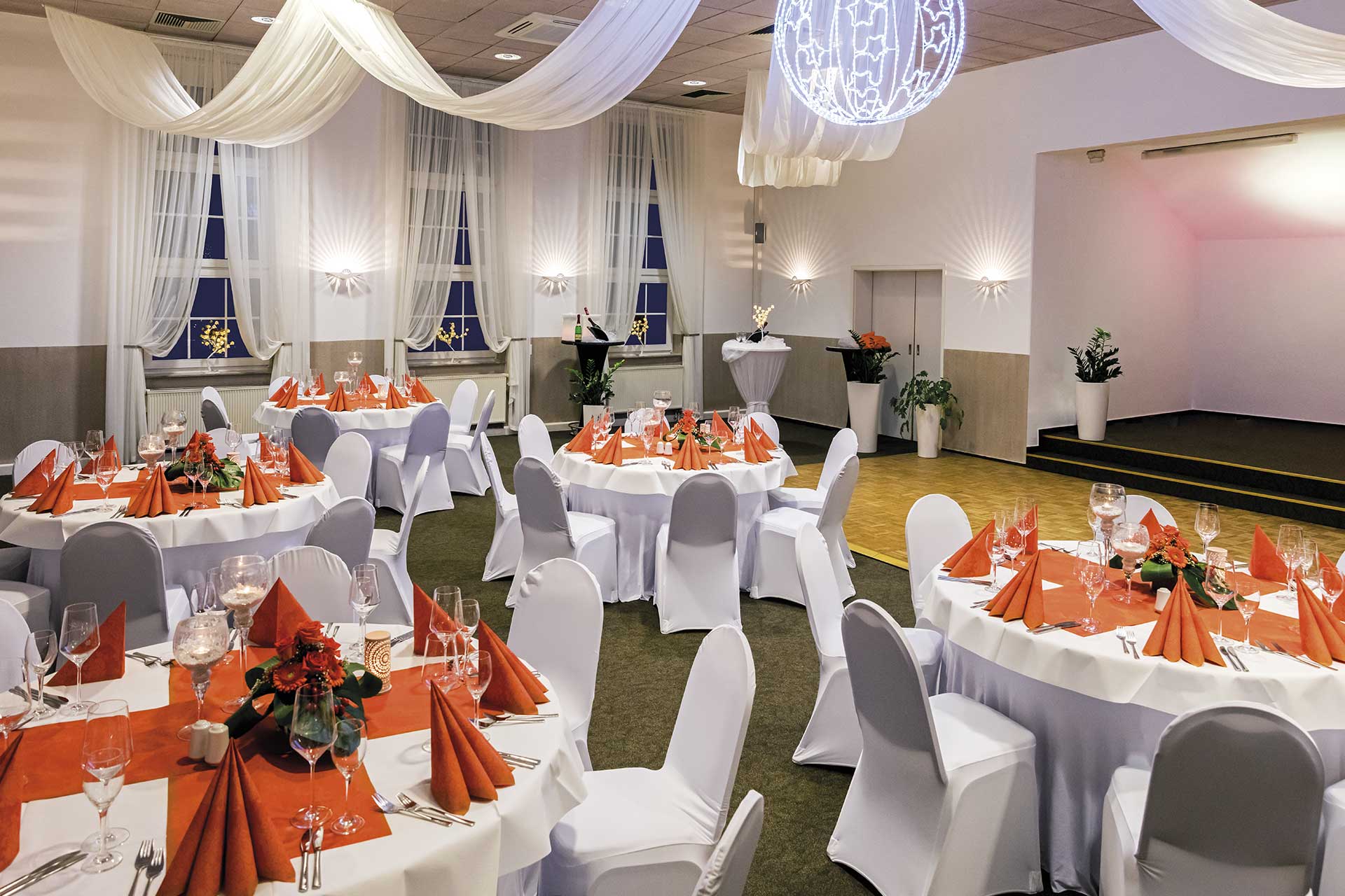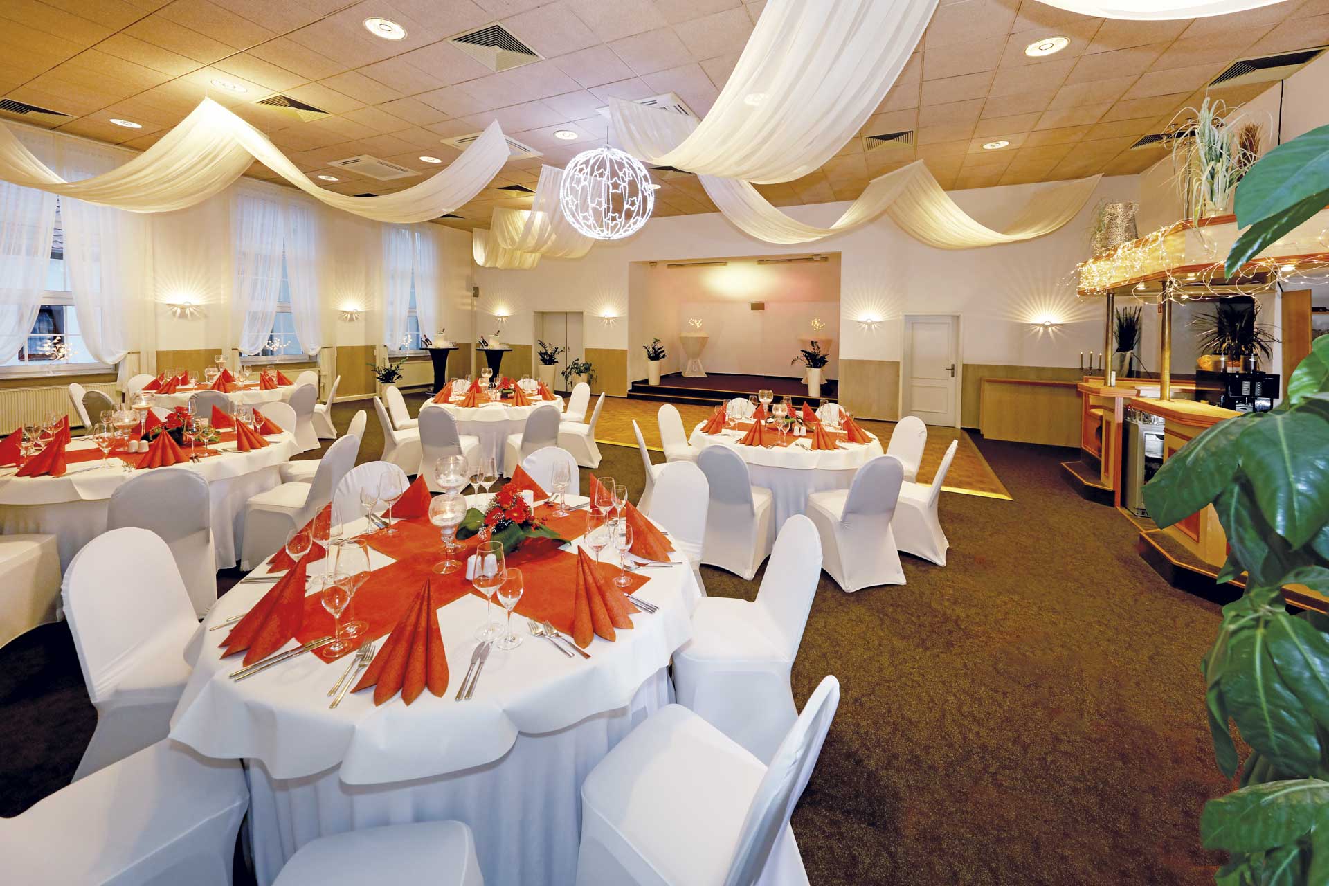 Unser Festsaal in der ersten Etage mit einer Kapazität von bis zu 100 Personen bietet den perfekten Rahmen für jede Art von Veranstaltung, sei es eine Hochzeit oder eine wichtige geschäftliche Konferenz.